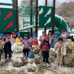 雪が降り、園庭にも少し雪が積もったので溶けてしまう前に雪遊びを楽しみました。 あちこちでいろいろな遊び方を楽しんでいましたよ。ここでは、雪をかき集めて雪玉づくり!小さな玉を転がしていくと、どんどん大きくなっていきました。 […]