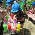 天気が良い日に園庭で色水遊びをしました。 「何色にしようかな~?」と自分の好きな色を選んでカップに入れていきます。 スプーンで混ぜ、色を変えていくのを楽しみます。 「赤と青を混ぜると紫になるん […]