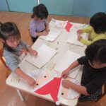 「サンタさん来てくれるかな~」 「〇〇が欲しいな~」クリスマスが来るのを 楽しみにしていました。 クリスマス製作では“ サンタさん ” の顔を作りました。 両面テープをはがすのはお手の物! ポリポリしたら…ほ […]