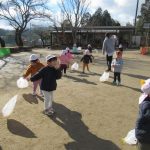 袋にトラの目や鼻・耳・模様のパーツを両面テープで貼り凧を作りました。 「出来た!」「トラさんかわいい」と遊ぶのをワクワクする子ども達! 皆で楽しく作ったあとは、園庭で思いっきり走って遊びました。 凧がついてくるのを見て「 […]