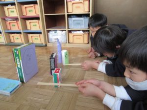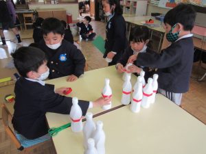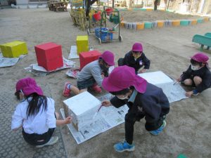 ゆり・ふじ組で8つのグループに分かれ、楽しいゲームを製作中です。子ども達とどんなゲームがいいかな?と話し合って、ボーリング・お手玉投げ・たたきずもう・ボール転がし・ワニたたき・魚釣り・射的・ダルマ落としに決まりました。「にじいろらんど」とネーミングしましたよ。各グループでみんなに楽しんでもらえるよう相談し、試行錯誤しながら奮闘中です!