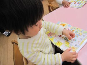 もうすぐ つくし組、シール帳面のシール貼りの練習もはじめましたよ。