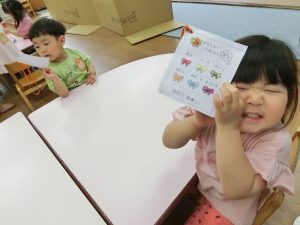 いろみつけカードを手渡すと「オレンジ見つける~!」「僕、みずいろ~!」と