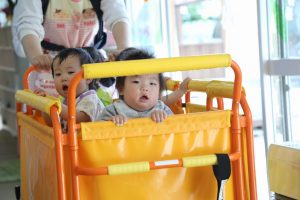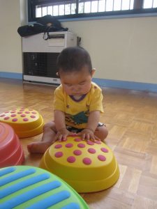 つくし組とホールでサーキット遊びをしました。乳幼児用のウェーブ平均台や坂道、カラーBOXくぐり、ジャンピングマット等たくさん身体を動かし楽しみましたよ。まずは避難車に乗ってホールへしゅっぱ~つ!上手につかまり立ちが出来るようになりました!