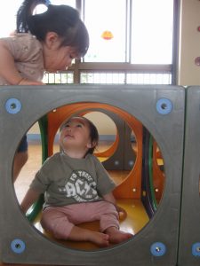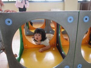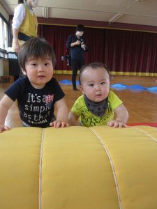 初めてホールで遊んだ子どもたち。だんだん場所に慣れてくると、様々な所に興味を持ち移動したり、乗ってみたり、叩いてみたり・・・!笑顔で楽しむ姿が見られましたよ。これからもたくさん身体を動かして遊んでいきたいと思います!