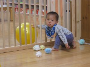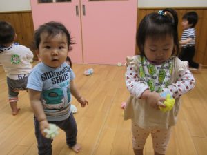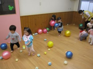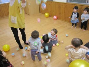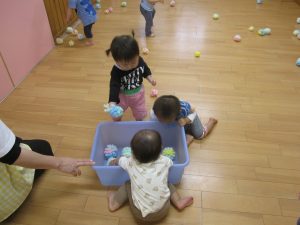 つくし組は、ボール遊びがだーいすき!大きなボールやスポンジボールを転がしたり、投げたりして楽しんでいますよ。