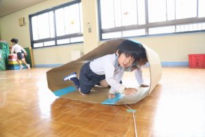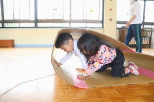 段ボールの中に入り、二人で力をあわせてハイハイで進んでいきます。