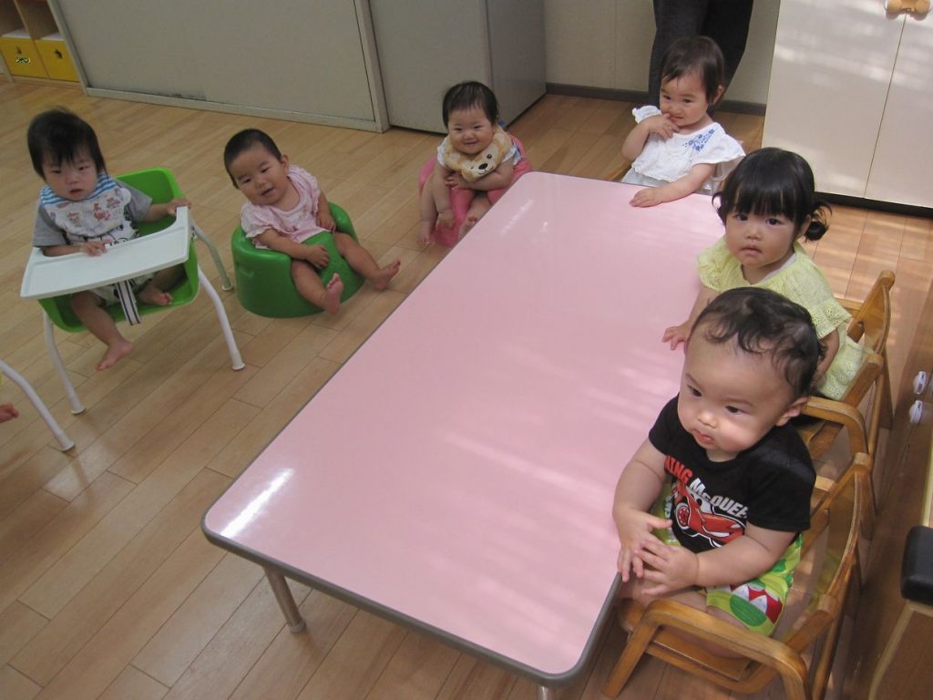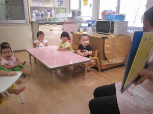 入園して3カ月・・・保育園の生活にも慣れ、入園当初に比べて様々な表情や姿を見せてくれます。そんな子ども達の可愛らしい姿を紹介します♪子ども達が大好きな「もこもこもこ」の絵本。「にょき」という言葉が特に好きで、みんな声に出して大笑い!!