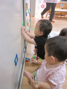 遊びを繰り返し楽しむことで磁石がくっつくことを覚えたよ!ぺたっと付けたり、引っ張って取ったりして楽しんでいます!