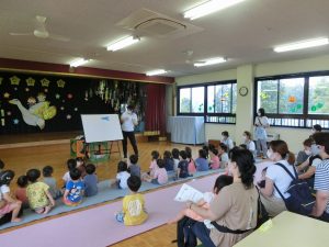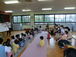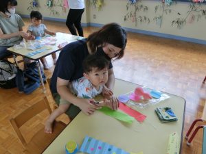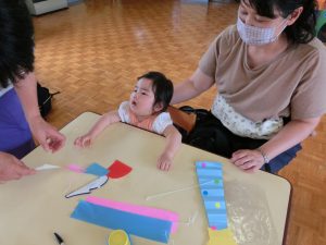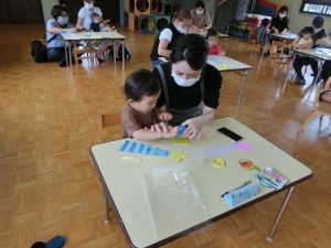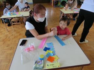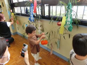 今日は未就園児を招待しての七夕会。ちゅうりっぷ組のお友だちと一緒に『なにかな?なにかな?』のパネルシアターやアンパンマンの『七夕』のDVDも観ました。