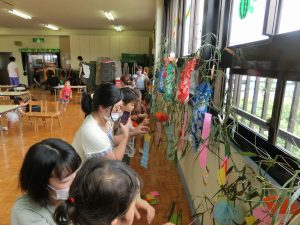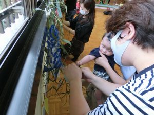 出来上がった笹飾りを願いを込めて笹に飾りました。