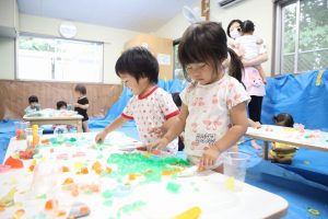 たくさん遊び、寒天を楽しめるようになった子ども達は冷たくて気持ち良さそうな顔、包丁で切れて嬉しそうな顔、夢中で遊ぶ真剣な顔、、、!色々な表情を見せてくれました!また楽しい感触遊びをしていきたいと思います!