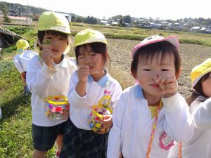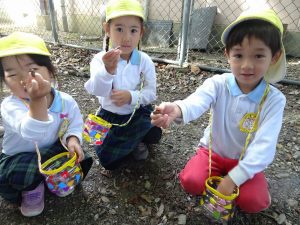澄み渡る青空の中、みんなで散歩に出かけました。山の散歩道にはどんぐりがいっぱい落ちていましたよ。大きなどんぐりや可愛い赤ちゃんどんぐりを見つけてたくさんの歓声があがりました。手作り鞄の中は子供たちが夢中になって拾った宝物で一杯になりました。