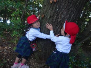 どんぐりの木って大きい~!両手を広げて抱きついて大きさを確かめていましたよ。