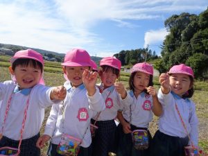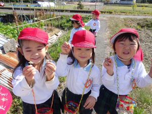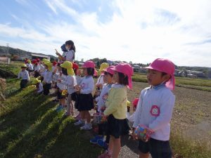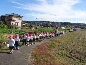 園から少し離れた農道の方まで出かけました。みんなで上手に並んで歩いていけるようになってきましたよ。