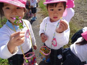 道端に咲いている小さな花を見つけたり、エノコログサを摘んでくすぐりあっこをしたりと秋の自然に触れながら楽しい時間を過ごしました。