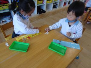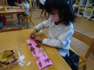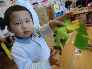 散歩で拾ってきたどんぐりや落ち葉を使ってリース作りをしました。赤や黄色の綺麗な葉っぱ、どんぐりや木の実を考えながら貼っていく姿が見られましたよ。