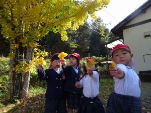 保育園の入口にある大きなイチョウの木の落ち葉を手に取り、黄色の鮮やかな色にみんなで「きれい~!」と感動していました。