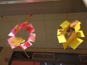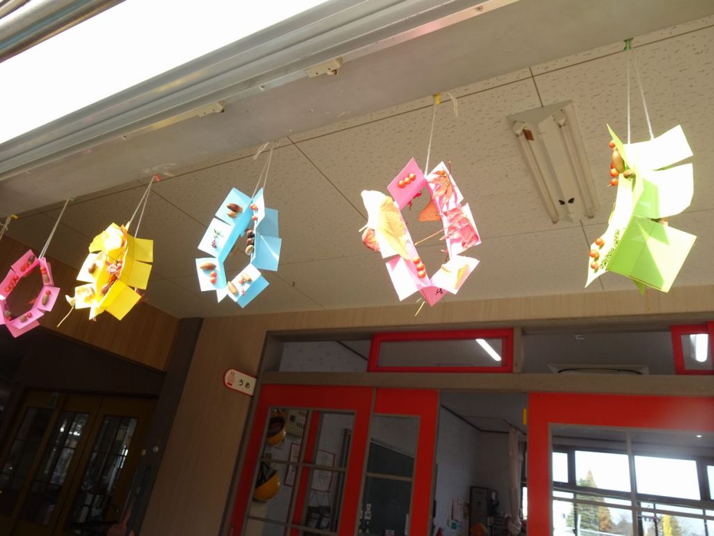 出来上がったリースを飾ると風に揺られてくるくる回り廊下が華やかに!!子ども達もそれを見ながら秋の訪れを感じていますよ。