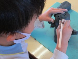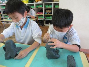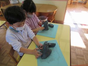土粘土の感触や自分のイメージを形にする楽しさを味わいながら取り組むことができました。完成した作品が少しずつ乾いて色が変わったり固まってくると「色が変わってる!」「カチコチになってる!」と不思議な発見もありましたよ。