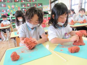 土粘土の感触を楽しみながら、劇の発表会で自分が演じた役を表現しました。