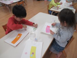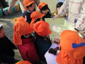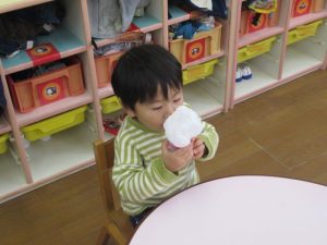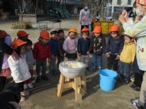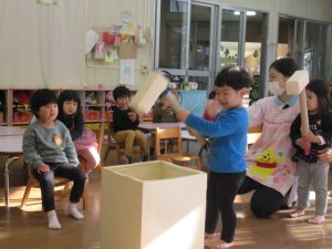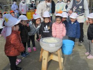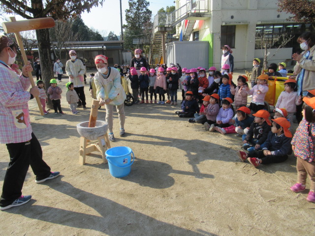 「ご飯の良い匂い~~!」もちつきを目の前で見ました。 もちをつく職員を元気いっぱいの声で応援し、もち米が おもちに変身すると「すごーーい!」とビックリ顔! 「美味しそうだね~~」と目を輝かせていました。 次の日…部屋で “ もちつきごっこ ” がスタート!! もちろんかけ声は「ぺったん ぺーーったん」 まだかまだかと自分の番が来るのを待ちわびていましたよ。 力いっぱい つく姿がとってもたくましい! ついた後は “ おもちクイズ ” 保「焼いた おもちは どんな風に変身すると思う?」 子「うーん、なんだろう?!」 保「正解は…ぷく~って膨らむんだよ!」 ゼリーのカップとストロー、ビニール袋で作ったおもちくん← (息を吹くと ビニール (顔つき)が膨らみます)を 見せると「うわあ~~!!」と釘付けでしたよ。 大きく息を吸って~…「ふ~~~~!!!!!」 上手に膨らむと「やったー!大きくなった~」と 大喜びでした。後に、「こんにちは」「何してるの?」 ごっこ遊びに繋がっていました。 〈番外編〉 おもちくんの可愛らしい飾り付けは 子どもたちが のりを使って型抜きを貼りましたよ♪ 楽しそうな笑顔がたくさん見られて良かったです。
