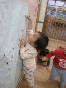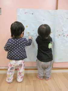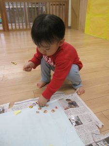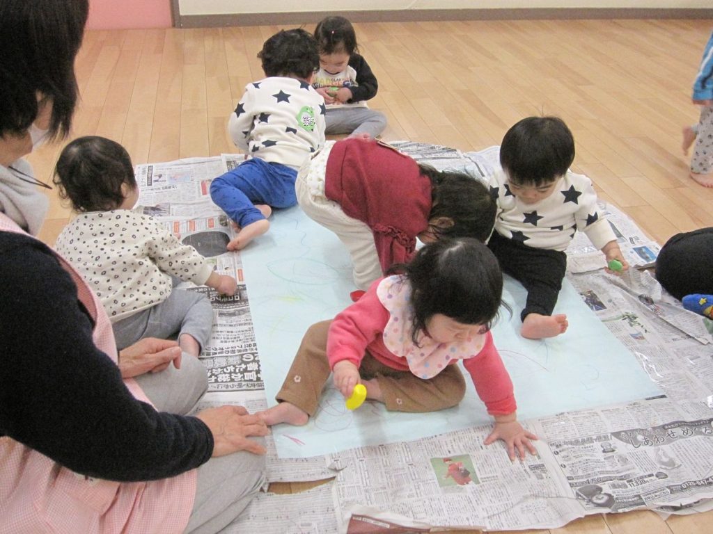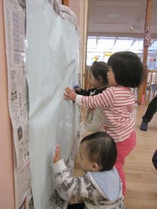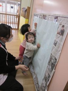 手先を上手に使えるようになってきた子ども達。大きな紙を床と壁に広げ、2日に分けてクレヨン・シール遊びを楽しみました。クレヨンと大きな紙を見て「わあ!」「やったあ!」と大喜び!!
