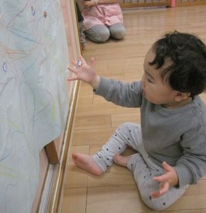 保育士が「こうやって描くんだよ!」と描いてみるとじーっと見つめて真似っこします。