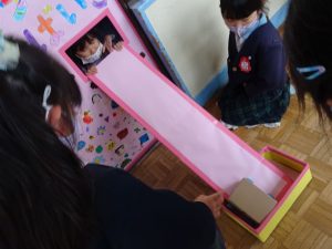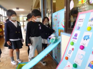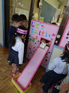 みんなで作った自動販売機は欲しいもののボタンを押して、お金を入れると商品がすべり台をすべって出てくるシステム!