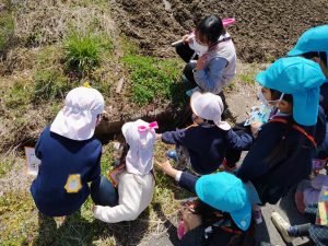 ちゅーりっぷ組の子がなかなか見つけられなかった つくしは草の斜面を下りて、