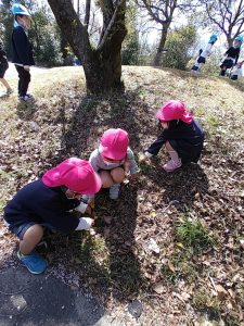 天気の良い日に散歩や築山へ行って、園庭では味わえない楽しさを感じましたよ。