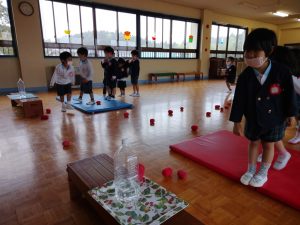ペットボトルを倒すべく、玉入れの玉を投げます。