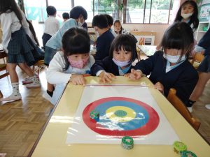 キャップを指でチョンと飛ばして何点の的にはいるかな?的飛ばしゲームは大盛りあがりです。狙いを定めて「えいっ!」指先の微妙な加減が難しいようですよ。