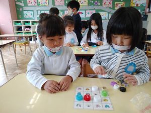 部屋では落ち着いて脳を刺激するゲームも。ペットボトルのキャップを使っての神経衰弱ゲームは大のお気に入り!