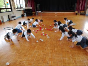 体幹を鍛える遊びのひとつ。ハイハイ玉運びゲームです。