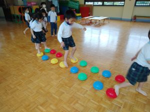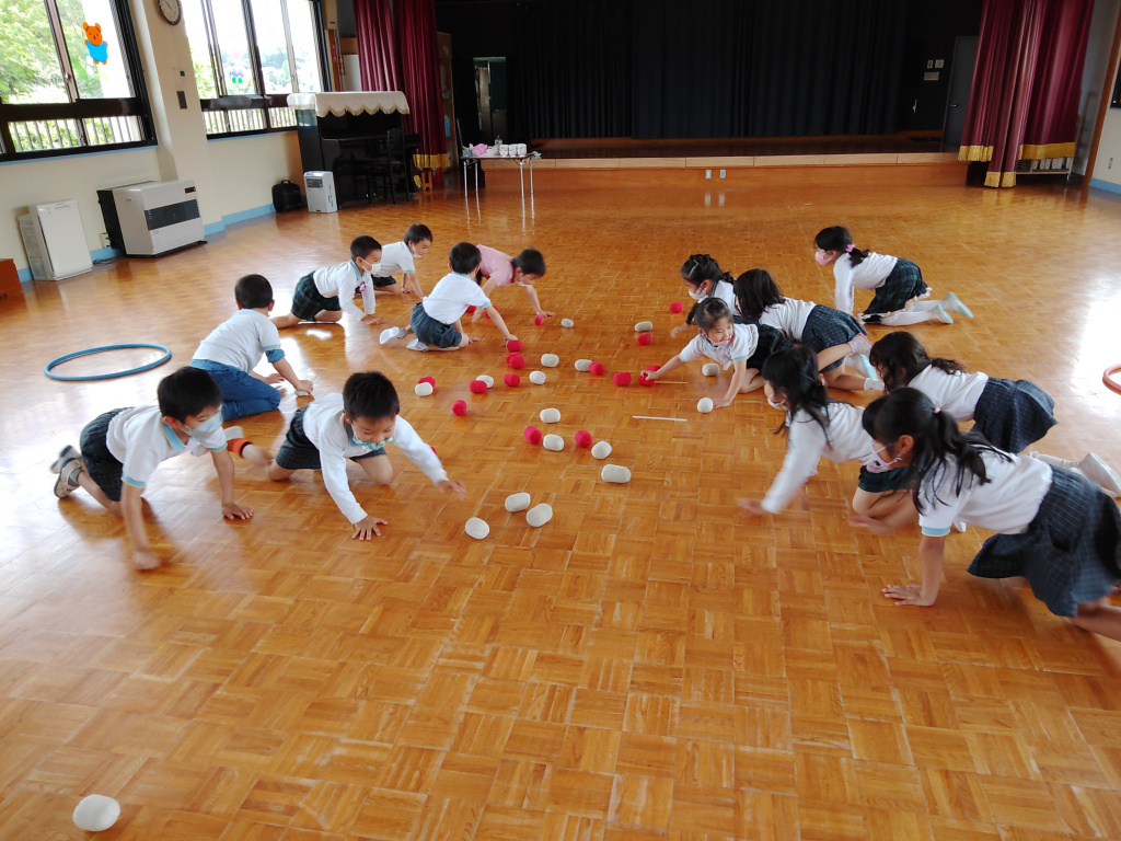 進級して2ヶ月がたち新しいクラスにも慣れてきて、元気な声がたくさん響いています。戸外では鬼ごっこをして園庭を走り回ったり泥だんごを作ったりと、友達と関わり合いながら楽しむ姿が見られますよ。体幹を鍛えることは姿勢保持にも繋がってきます。いろいろな道具を使ってのサーキット遊びは子ども達の大好きな活動のひとつです。