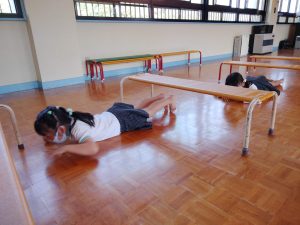 右足、左足と交互に足を運び両手を広げてバランスをとって渡ります。平均台はとっても上手に渡れるようになりましたよ。