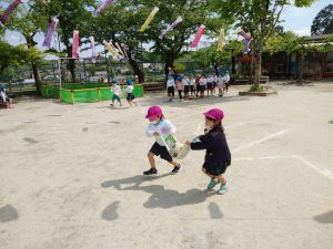 天気が良い日は戸外で思い切り体を動かして、リレー方式のゲームも楽しんでいますよ。2人て協力しあってボール運びに挑戦!「かんばれー!」と友達の応援にも力が入ります。