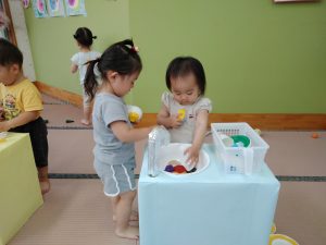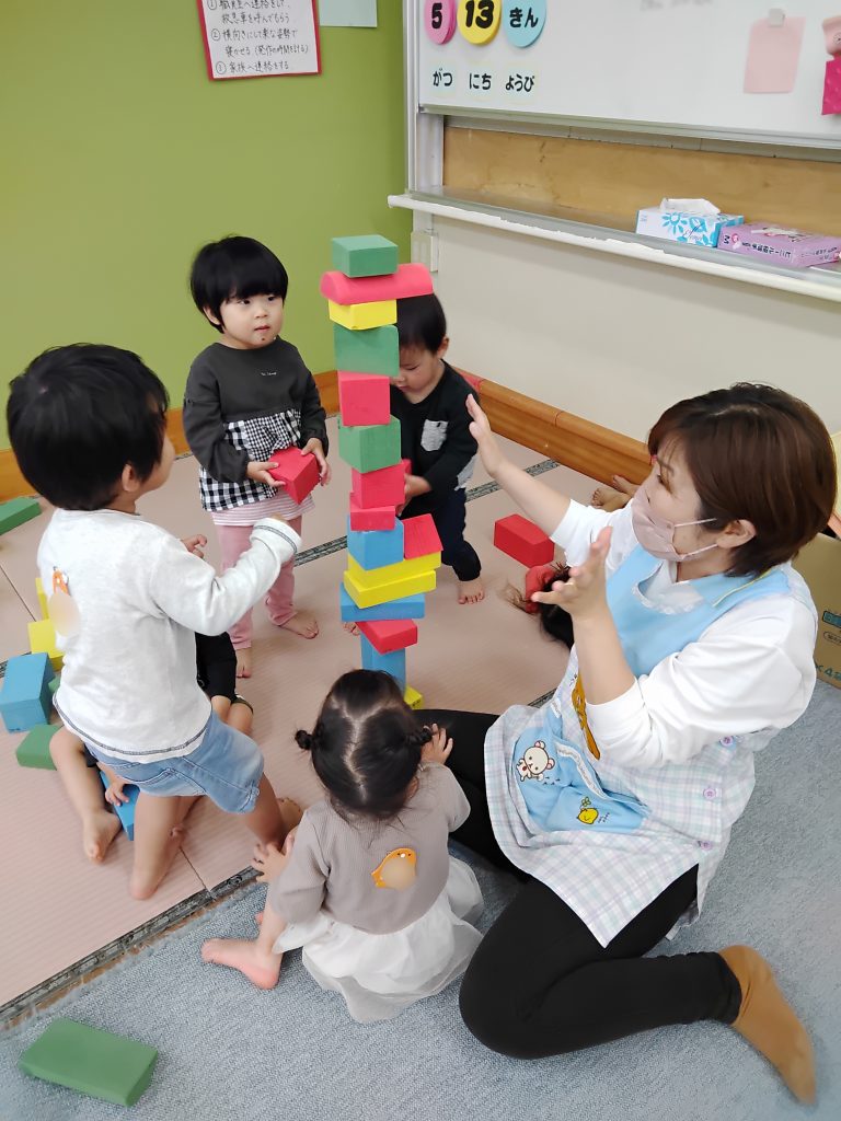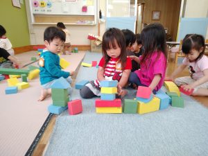 保育園やクラスにも慣れ、たくさんの笑顔が見られるようになりました♪様々な玩具でそれぞれ好きな遊び方をしていた子ども達でしたが、保育士や友達と遊ぶことも楽しいと感じられるようになってきましたよ!