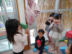 自分たちの周りをブロックでぐるっと囲んでいます!囲み終えると「お風呂できたよ〜」と友達や保育士を呼んで楽しんでいました!中には身体や頭をゴシゴシ洗う真似をしている姿も見られましたよ。