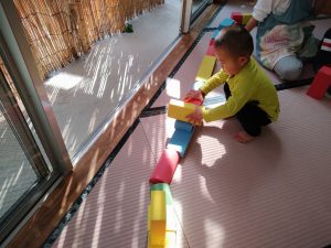 ブロックを一列に黙々と並べます。線路を作っているようです!