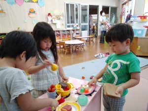 子ども達の大好きなままごと遊び♪手作りの水道でお皿や食べ物を「じゃー!」と言いながら洗っています。