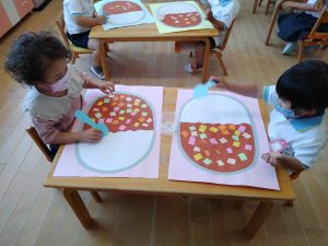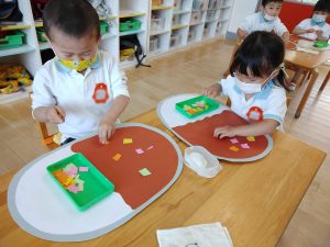 切った材料を全て貼る子、自分の好きな物をたくさん貼る子など様々でした。