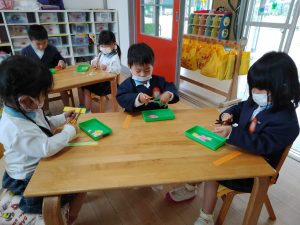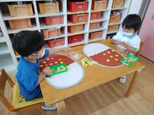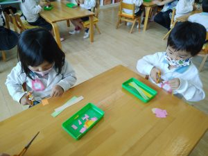 自分で作ることが楽しいみたいで「みてみてー!ここに貼ったよ」と嬉しそうに見せてくれましたよ。自分でやりたいという気持ちがみられ、大切にしていきたいなと思いました。