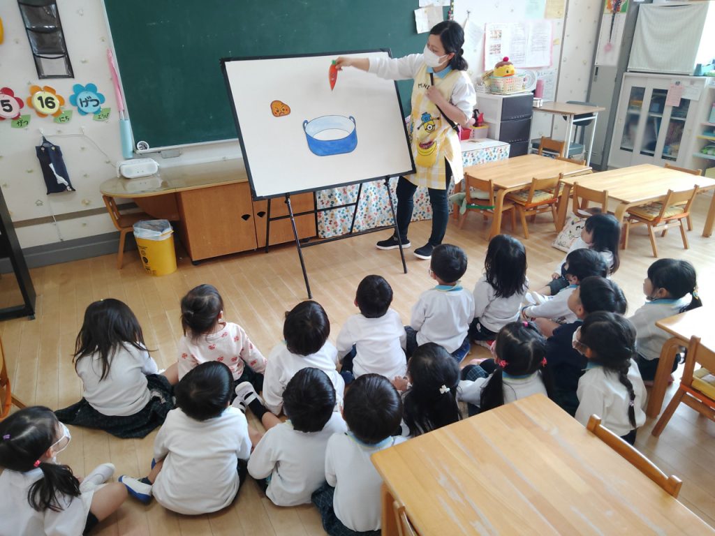 パネルシアターや絵本を通してカレーライスの作り方についてまずは知りました。