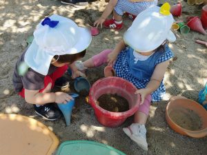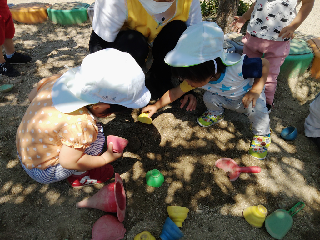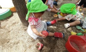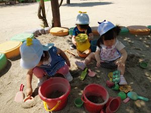 砂場で遊ぶと砂のサラサラやザラザラとした感触に夢中になっています。