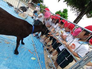 野菜をあげるとヤギが「メェ~」と鳴いて喜ぶ子ども達!ヤギさんお礼を言ってくれたのかな?