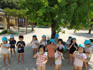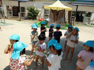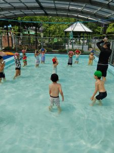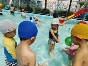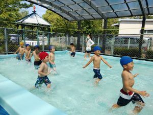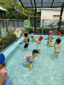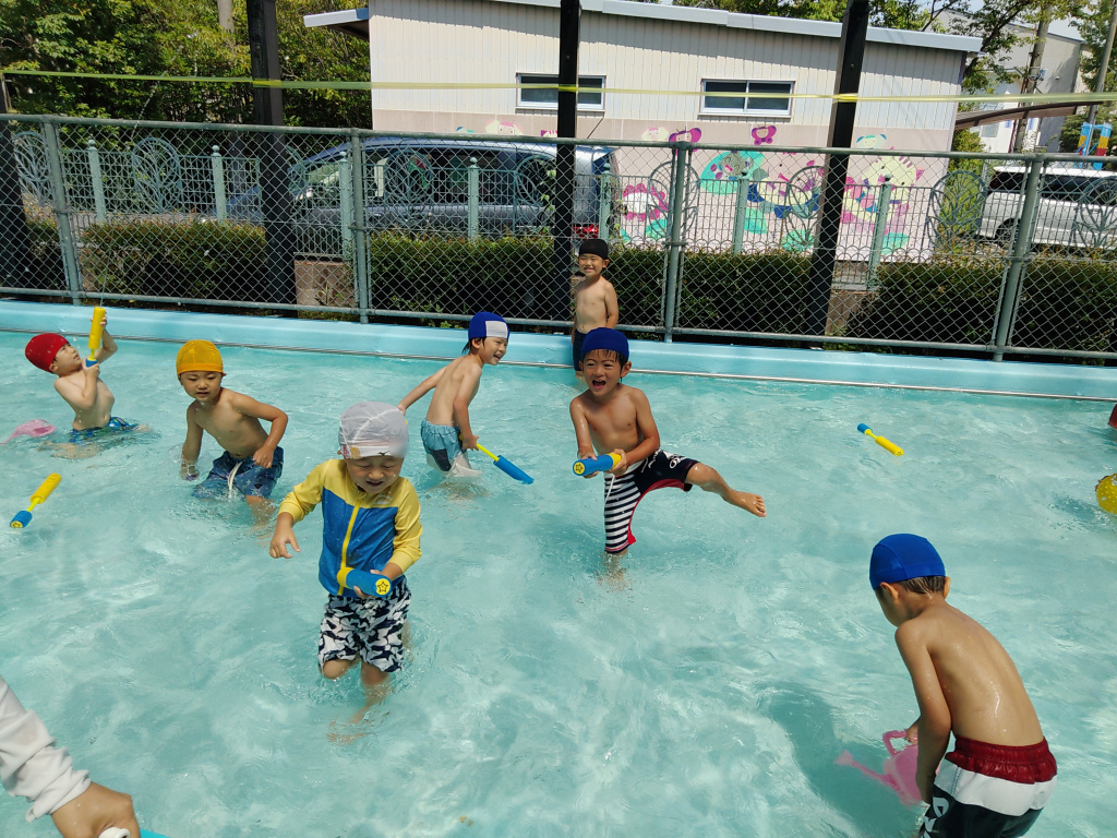 プール遊びが楽しい季節です。 「先生。今日はプール入る?」と毎日楽しみにしている子ども達、「プールに入るよ。」と返事をすると「やった〜。」と大喜びです。