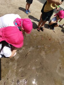 「先生見て見て。水たまりの上をしゃぼん玉が、ぴょんぴょん跳んでるよ。」と、しゃぼん玉が風に吹かれて水たまりの上を弾む様子を見てびっくり。水たまりに向かって何度もしゃぼん玉を作っていました。