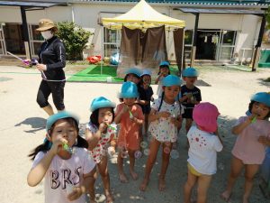 何度も水たまりに向かってしゃぼん玉を吹くと、しゃぼん玉の半円ができ、またまた大喜び。水たまりに向かう子ども達が可愛かったですよ。